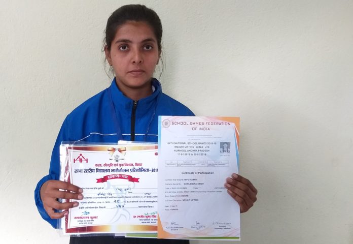 पहली दफा 2017 में सीतामढ़ी के डुमरा स्कूल में आयोजित राज्यस्तरीय विधालय भारोतोलन प्रतियोगिता में नवादा की नीपू ने बेहतर प्रदर्शन की थी। वह तीसरे स्थान पर रही थी। उसे कांस्य पदक मिला था। लेकिन मेहनत जारी। दूसरी दफा 2018 में वह बिहार की गोल्डन गर्ल हो गई। राज्य के 31 जिले के प्रतिभागियों ने भाग लिया था। प्रत्येक जिले से आठ खिलाड़ी भाग लिया था। इसमें अंडर 19 में पूरे बिहार में नीपू गोल्ड मेडल लाई। कोच टीचर अरविंद कुमार के मुताबिक, नीपू अपनी क्षमता के बदौलत अपनी पहचान बनाई है।