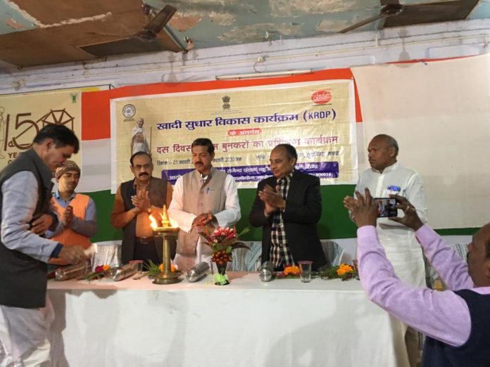 कौआकोल। खादी सुधार विकास कार्यक्रम के तहत खादी एवं ग्रामोधोग आयोग पटना की वित्तीय सहायता से ग्राम निर्माण मण्डल सर्वोदय आश्रम सोखोदेवरा में शनिवार से दस दिवसीय बुनकरों का प्रशिक्षण कार्यक्रम की शुरुआत की गई। प्रशिक्षण का उदघाटन खादी एवं ग्रामोधोग आयोग के सहायक निदेशक एस के भुइँया, निदेशक डॉ भी एस बागुल, ग्राम निर्माण मण्डल के अध्यक्ष प्रभाकर कुमार एवं प्रधानमंत्री अरविंद कुमार ने संयुक्त रूप से द्वीप प्रज्ज्वलित कर एवं राष्ट्रपिता महात्मा गांधी की प्रतिमा पर खादी सूत का माला पहना एवं पुष्प अर्पित कर किया।