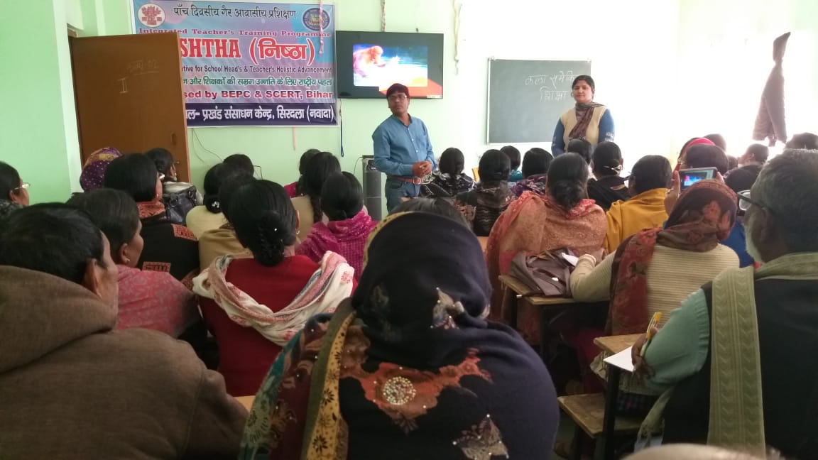 नवादा सिरदला में आयोजित ‘निष्ठा’ प्रशिक्षण के पहले बैच के तीसरे दिन बुधवार को प्रशिक्षक राजेश कुमार भारती ने कला समेकित शिक्षा पर प्रकाश डाला। उन्होंने कहा कि यदि सिखाने की प्रक्रिया में दृश्य- कला, प्रदर्शन कला, चित्रकला, साहित्य कला का संयोजन किया जाए तो बच्चों को अवधारणा समझने में आसानी होती है।