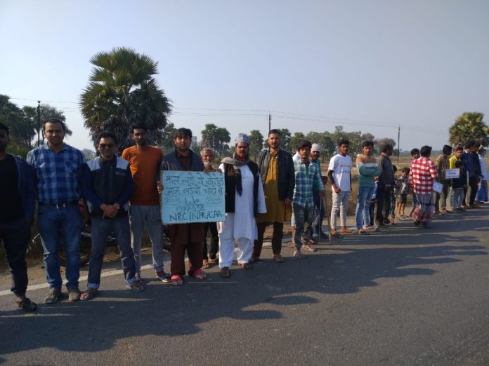 नरहट प्रखंड के शेखपुरा मीनापुर कुशा सहित दर्जनों गांव के मुस्लिम समुदाय के लोग गांव में लगभग रोड किनारे 6 किलोमीटर का सीएए और एनआरसी कानून के विरोध में हजारों महिलाओं पुरुषों ने सड़क किनारे शेखपुरा से नरहट तक विशाल मानव श्रृंखला बना कर एनआरसी सीएए कानून वापस लेने की मांग लेकर शनिवार को हजारों लोगों ने काली पट्टी बांध कर एवं बैनर तले के साथ नरहट से शेखपुरा मानव श्रृंखला का नेतृत्व किया।